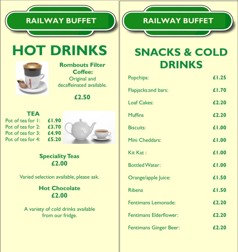 Our railway themed Tea Room is open during normal Museum opening hours and can be found next to the Museum Shop. Last service is at 4:30 pm.